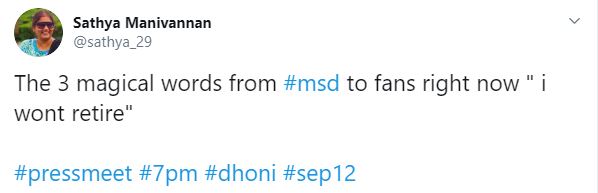 "The 3 magical words from #msd to fans right now " i wont retire" #pressmeet #7pm #dhoni #sep12," another Twitterati wrote.