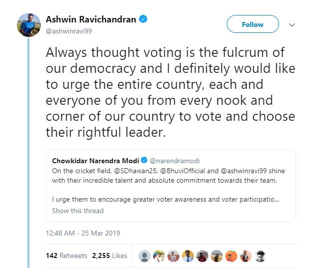 Ashwin first tweeted and urged the people to cast their votes and choose their rightful leader. His tweet reads, “Always thought voting is the fulcrum of our democracy and I definitely would like to urge the entire country, each and every one of you from every nook and corner of our country to vote and choose their rightful leader.”