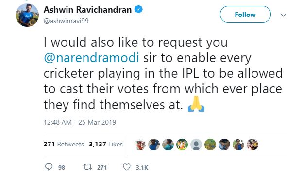 In another tweet, Ashwin writes: “I would also like to request you @narendramodi sir to enable every cricketer playing in the IPL to be allowed to cast their votes from whichever place they find themselves at.”