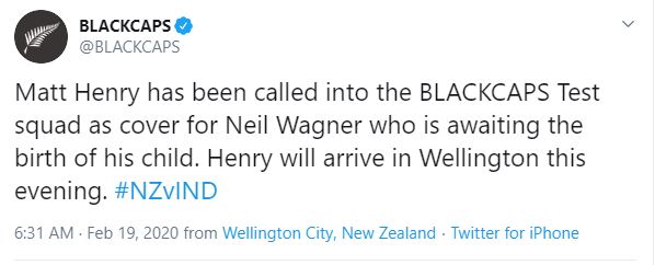 "Matt Henry has been called into the BLACKCAPS Test squad as cover for Neil Wagner who is awaiting the birth of his child. Henry will arrive in Wellington this evening. #NZvIND," BLACKCAPS tweeted.