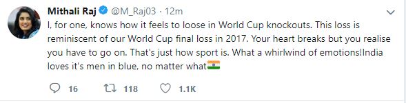 "I, for one, knows how it feels to loose in World Cup knockouts. This loss is reminiscent of our World Cup final loss in 2017. Your heart breaks but you realise you have to go on. That's just how sport is. What a whirlwind of emotions! India loves it's men in blue, no matter what," Raj tweeted.
