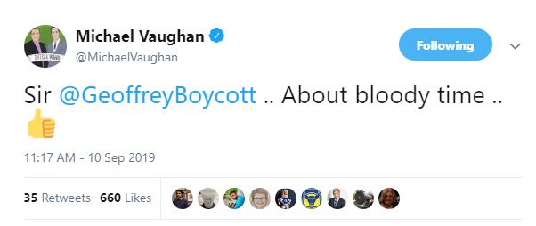 "Sir @GeoffreyBoycott. About bloody time," Vaughan tweeted.