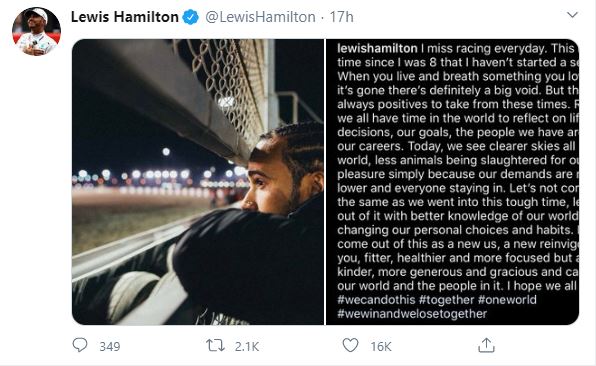 Taking to Twitter, Hamilton wrote: "I miss racing every day. This is the first time since I was 8 that I haven't started a season. When you live and breathe something you love, when it's gone there's definitely a big void. But there are always positives to take from these times".