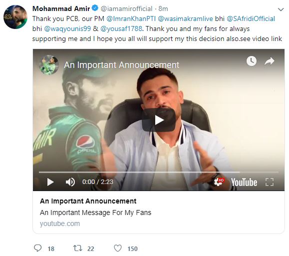 "Thank you PCB, our PM @ImranKhanPTI @wasimakramlive bhi @SAfridiOfficial bhi @waqyounis99 & @yousaf1788. Thank you and my fans for always supporting me and I hope you all will support my this decision also see video link," Amir tweeted.