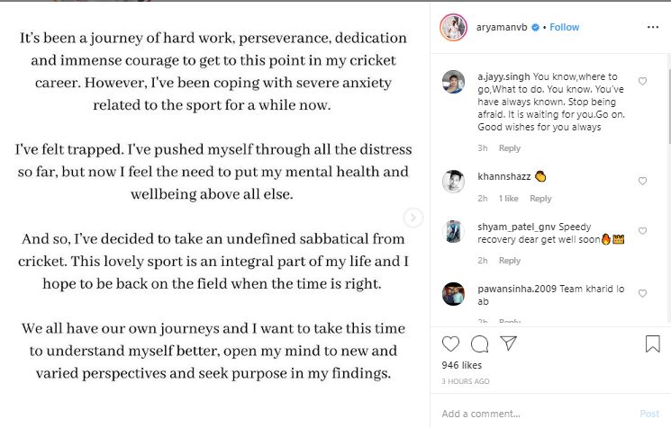 Aryaman released a statement on Instagram and said: "It has been a journey of hard work, dedication and immense courage to get to this point in my cricket career. I have been coping with severe anxiety related to the sport for a while now".