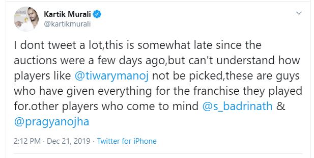 "I don't tweet a lot, this is somewhat late since the auctions were a few days ago, but can't understand how players like @tiwarymanoj not be picked, these are guys who have given everything for the franchise they played for.other players who come to mind @s_badrinath &