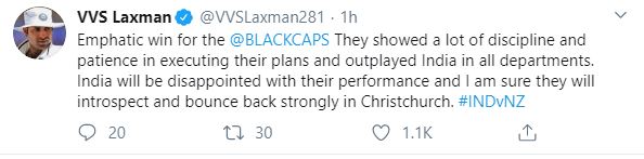 "Emphatic win for the @BLACKCAPS. They showed a lot of discipline and patience in executing their plans and outplayed India in all departments. India will be disappointed with their performance and I am sure they will introspect and bounce back strongly in Christchurch. #INDvNZ," Laxman tweeted.
