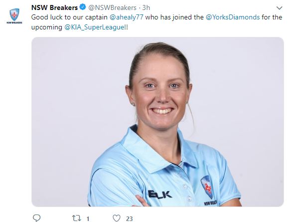 NSW Breakers, a team that competes in Women's National Cricket League in Australia, in a tweet said: "Good luck to our captain @ahealy77 who has joined the @YorksDiamonds for the upcoming @KIA_SuperLeague!!"