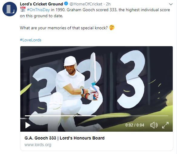 Lord's Cricket Ground in a tweet, said, "#OnThisDay in 1990, Graham Gooch scored 333, the highest individual score on this ground to date. What are your memories of that special knock?"