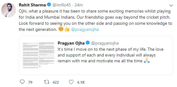 "Ojhi, what a pleasure it has been to share some exciting memories whilst playing for India and Mumbai Indians. Our friendship goes way beyond the cricket pitch. Look forward to seeing you on the other side and passing on some knowledge to the next generation. @pragyanojha," Sharma tweeted.