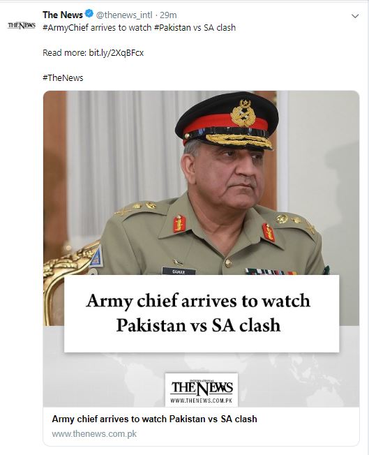 In a Tweet, The News International said, "#ArmyChief arrives to watch #Pakistan vs SA clash."