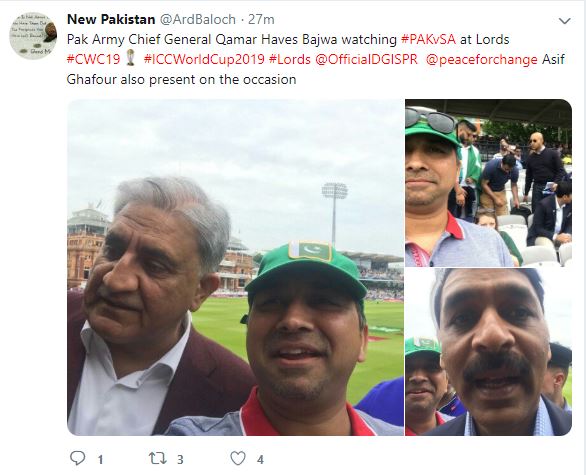 "Pak Army Chief General Qamar Haves Bajwa watching #PAKvSA at Lords #CWC19 #ICCWorldCup2019 #Lords @OfficialDGISPR @peaceforchange Asif Ghafour also present on the occasion," the user tweeted (sic).