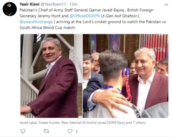 Another user posted a picture of Bajwa, who was all smiles at the stadium. The user in the caption said that British Foreign Secretary Jeremy Hunt and Ghafoor also arrived at the venue.