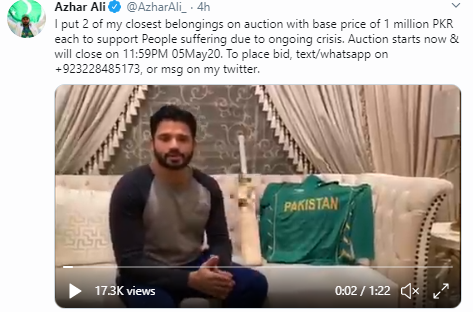 "I put 2 of my closest belongings on auction with base price of 1 million PKR each to support People suffering due to ongoing crisis. Auction starts now & will close on 11:59PM 05May20," Ali tweeted.