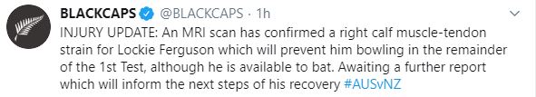 "INJURY UPDATE: An MRI scan has confirmed a right calf muscle-tendon strain for Lockie Ferguson which will prevent him bowling in the remainder of the 1st Test, although he is available to bat. Awaiting a further report which will inform the next steps of his recovery," the Blackcaps tweeted.