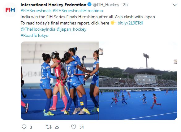 International Hockey Federation wrote, "India win the FIH Series Finals Hiroshima after all-Asia clash with Japan #RoadToTokyo."