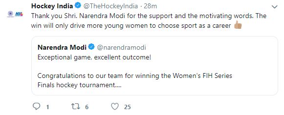 "Thank you Shri. Narendra Modi for the support and the motivating words. The win will only drive more young women to choose sport as a career," Hockey India tweeted.