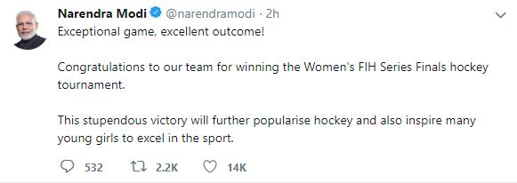 In a Tweet, PM Modi said, "Exceptional game, excellent outcome! Congratulations to our team for winning the Women's FIH Series Finals hockey tournament. This stupendous victory will further popularise hockey and also inspire many young girls to excel in the sport."