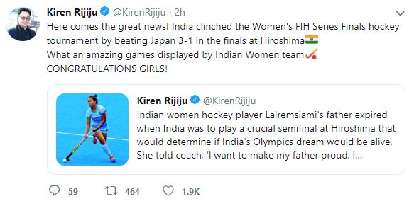 "Here comes the great news! India clinched the Women's FIH Series Finals hockey tournament by beating Japan 3-1 in the finals at Hiroshima What an amazing game displayed by Indian Women team. CONGRATULATIONS GIRLS!" Rijiju said.
