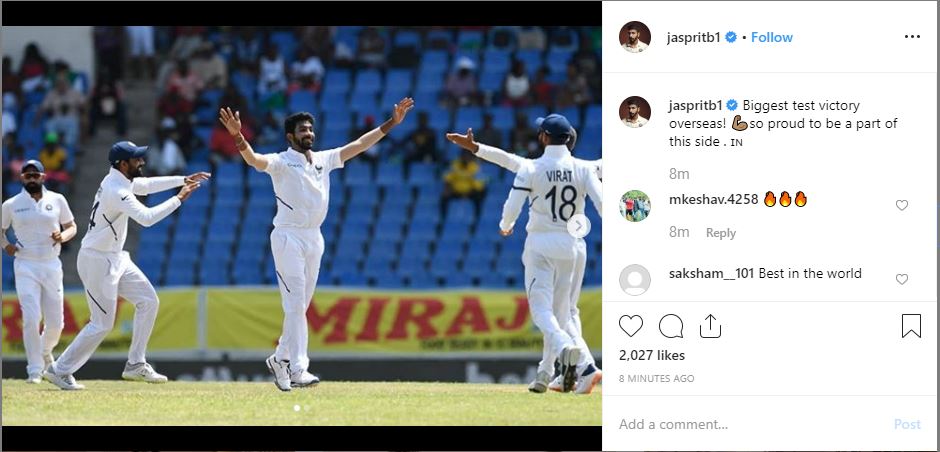 In an Instagram post, Bumrah posted two pictures and wrote: "Biggest test victory overseas, so proud to be a part of this side" as the caption.