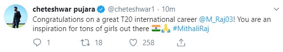 "Congratulations on a great T20 international career @M_Raj03! You are an inspiration for tons of girls out there #MithaliRaj," Pujara tweeted.