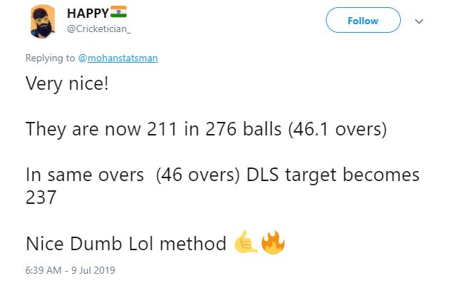 Another user wrote: "Very nice! They are now 211 in 276 balls (46.1 overs) In same overs (46 overs) DLS target becomes 237 Nice Dumb Lol method."