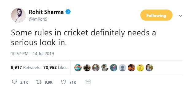 Rohit took to Twitter and wrote, " Some rules in cricket definitely needs a serious look in."