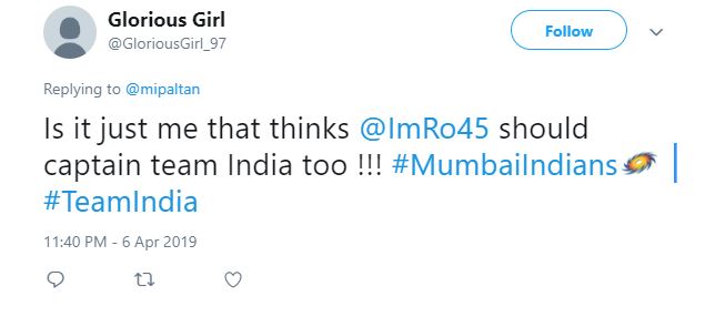 A user questioned, “Is it just me that thinks @ImRo45 should captain team India too !!! #MumbaiIndians #TeamIndia.”