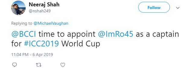 One Twitter user requested BCCI and wrote, “@BCCI time to appoint @ImRo45 as a captain for #ICC2019 World Cup.”