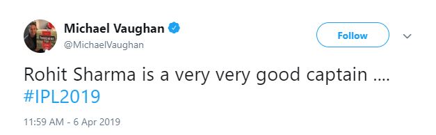 Even former England player also praised the Hitman Rohit Sharma and tweeted "Rohit Sharma is a very very good captain .... #IPL2019.”