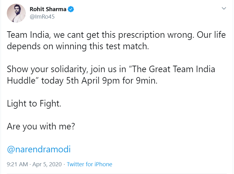 Taking to Twitter he wrote, "Team India, we cant get this prescription wrong. Our life depends on winning this test match. Show your solidarity, join us in "The Great Team India Huddle" today 5th April 9pm for 9min. Light to Fight. Are you with me? @narendramodi."