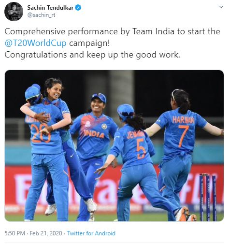 Sachin Tendulkar congratulates India on securing win over Australia in Women's T20 WC opener