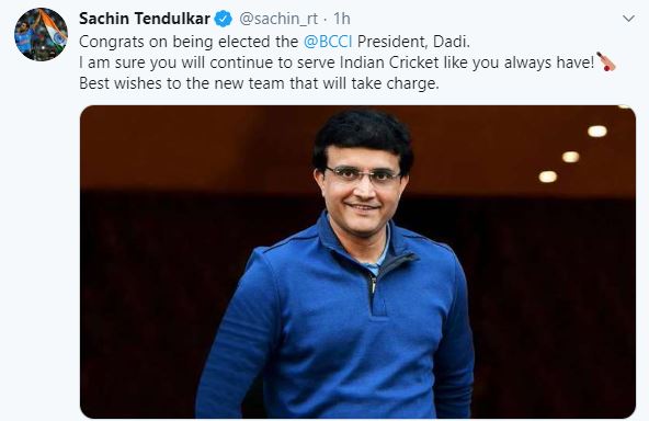 "Congrats on being elected the @BCCI President, Dadi. I am sure you will continue to serve Indian Cricket like you always have! Best wishes to the new team that will take charge," Tendulkar tweeted.