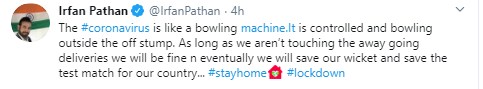 "The #coronavirus is like a bowling machine. It is controlled and bowling outside the off stump. As long as we aren't touching the away going deliveries we will be fine n eventually we will save our wicket and save the test match for our country... #stayhome #lockdown," Irfan tweeted.