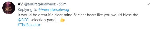 "It would be great if a clear mind & clear heart like you would bless the @BCCI selection panel... #TheSelector," the user tweeted.