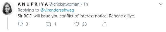 A user brought the topic of Conflict of Interest and wrote: "Sir BCCI will issue you conflict of interest notice! Rehene dijiye."