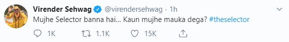 On the micro-blogging site, Sehwag wrote: "Mujhe Selector banna hai... Kaun mujhe mauka dega? #theselector." (I want to become a selector.... Who will give me a chance?)