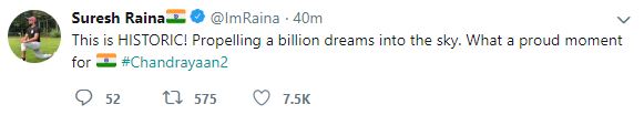 "This is HISTORIC! Propelling a billion dreams into the sky. What a proud moment for #Chandrayaan2," Raina said.