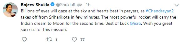 "Billions of eyes will gaze at the sky and hearts beat in prayers, as #Chandrayan2 takes off from Sriharikota in few minutes. The most powerful rocket will carry the Indian dream to Moon for the second time. Best of Luck @isro. Wish you great success for this mission," Shukla said.
