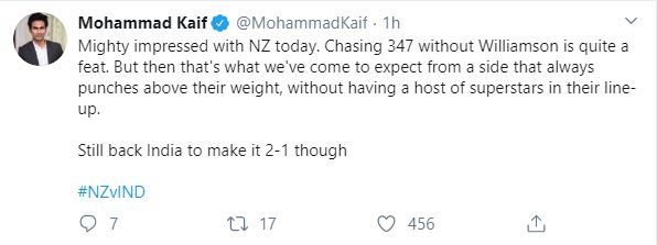 While former cricketer Mohammad Kaif said in a tweet: "Mighty impressed with NZ today. Chasing 347 without Williamson is quite a feat. But then that's what we've come to expect from a side that always punches above their weight, without having a host of superstars in their line-up. Still back India to make it 2-1 though #NZvIND."