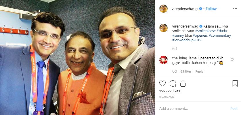 Last week, Sehwag shared a picture with his then teammate Sourav Ganguly and Gavaskar. "Kasam se.... kya smile hai yaar #smileplease #dada #sunny bhai #openers #commentary #iccworldcup2019," he said.