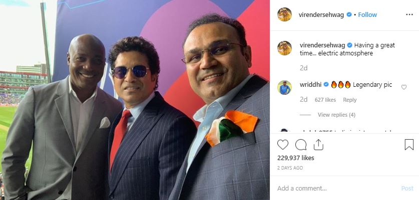 Earlier Sehwag clicked a selfie with Tendulkar and the West Indies great Brian Lara during the India-Pakistan clash, which India won by 89 runs.