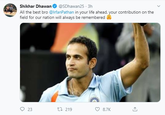 Taking to Twitter, Dhawan wrote, "All the best bro @IrfanPathan in your life ahead, your contribution on the field for our nation will always be remembered."
