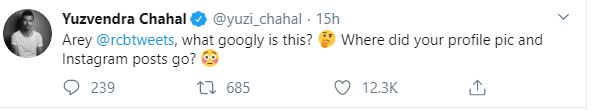 "Arey @rcbtweets, what googly is this? Where did your profile pic and Instagram posts go," Chahal tweeted.