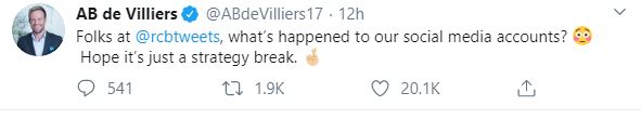 "Folks at @rcbtweets, what's happened to our social media accounts? Hope it's just a strategy break," de Villiers tweeted.