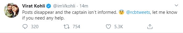 "Posts disappear and the captain isn't informed. @rcbtweets, let me know if you need any help," Kohli tweeted.