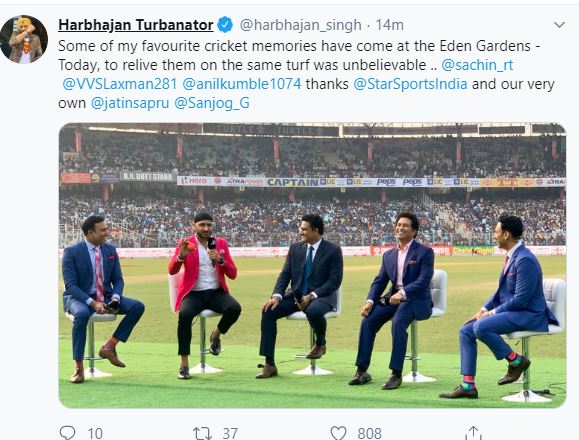 "Some of my favourite cricket memories have come at the Eden Gardens - Today, to relive them on the same turf was unbelievable .. @sachin_rt @VVSLaxman281 @anilkumble1074 thanks @StarSportsIndia and our very own @jatinsapru," Harbhajan tweeted.