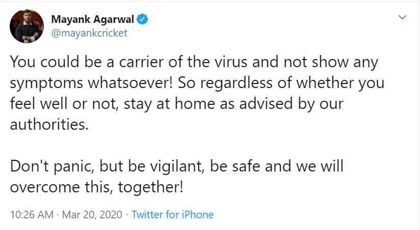 Stay at home, don't panic: Mayank Agarwal advises people amid COVID-19