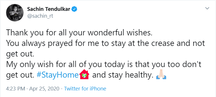"Thank you for all your wonderful wishes. You always prayed for me to stay at the crease and not get out. My only wish for all of you today is that you too don't get out. #StayHome and stay healthy," Tendulkar tweeted.