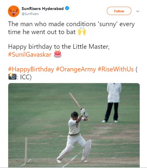 Mumbai Indians and Sunrisers Hyderabad also wished Gavaskar on his birthday.
